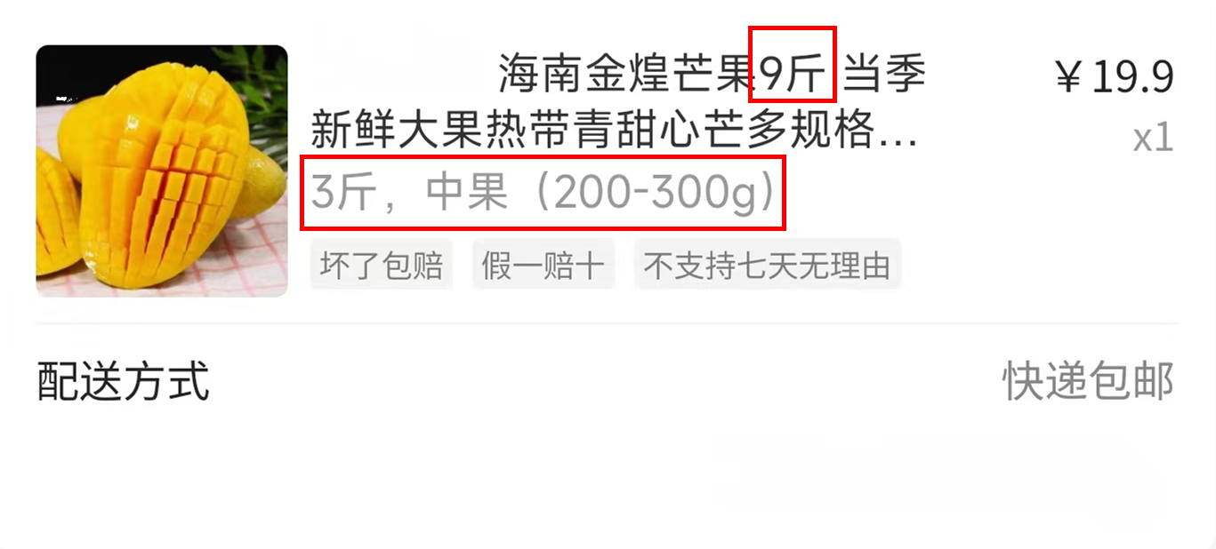 例如:标题描述【海南金煌芒果9斤 当季新鲜大果热带水果青甜心芒】,实际售卖的SKU中包含【3斤】、【5斤】、【9斤】;此时若用户下单,可能会出现商品标题显示9斤但实际SKU显示为3斤,造成相应的客诉。