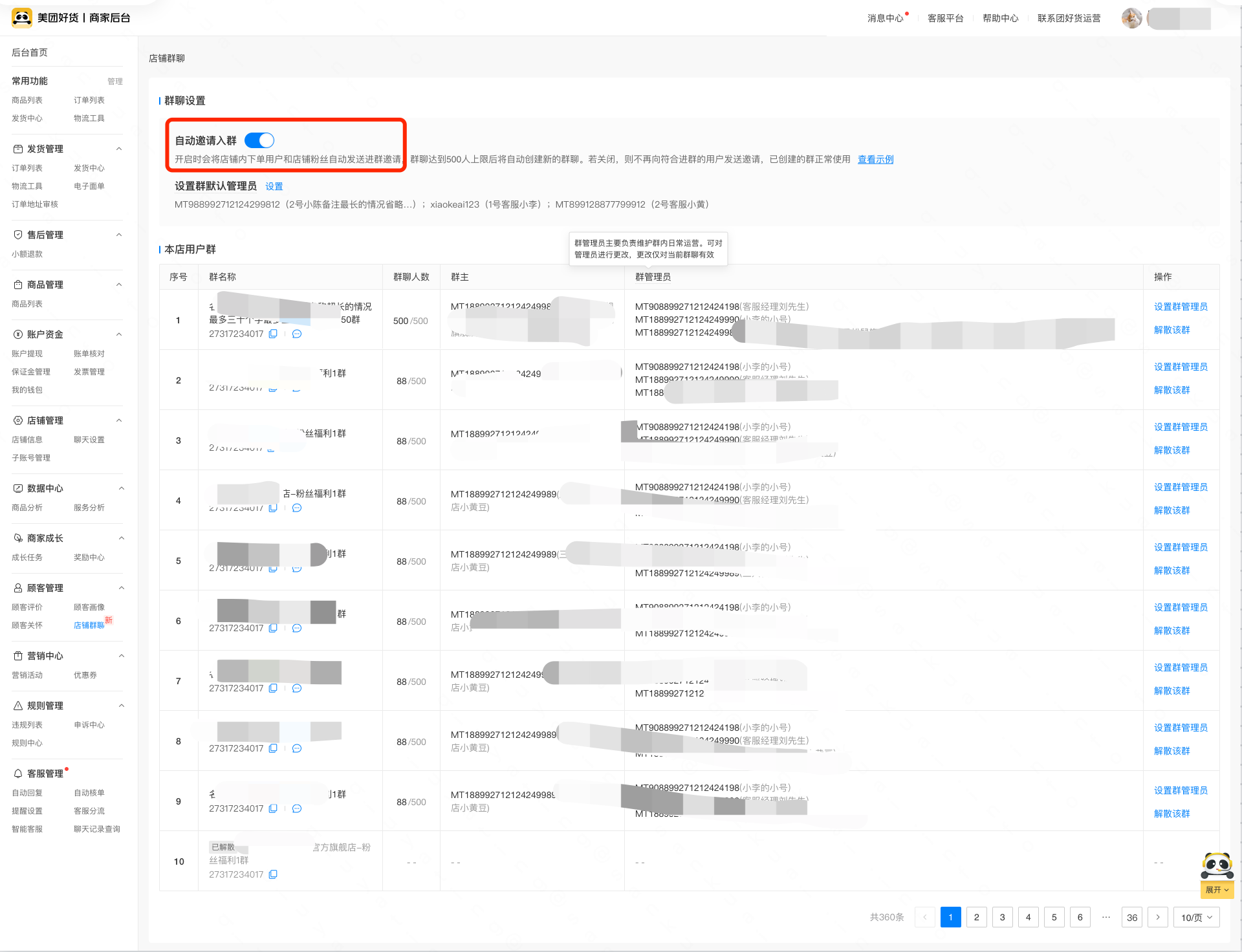 已经开通群聊功能,如何新增群? Customer Service Agent 2025年11月22日 13:31 暂不支持商家手动开新群,需商家在开启“自动邀请入群”开关的前提下,历史群聊达到人数上限后,系统将自动创建新的群聊;“自动邀请入群”开关入口:商家端(电脑端)-顾客管理-店铺群聊; 评论 0 条评论 请登录写评论。