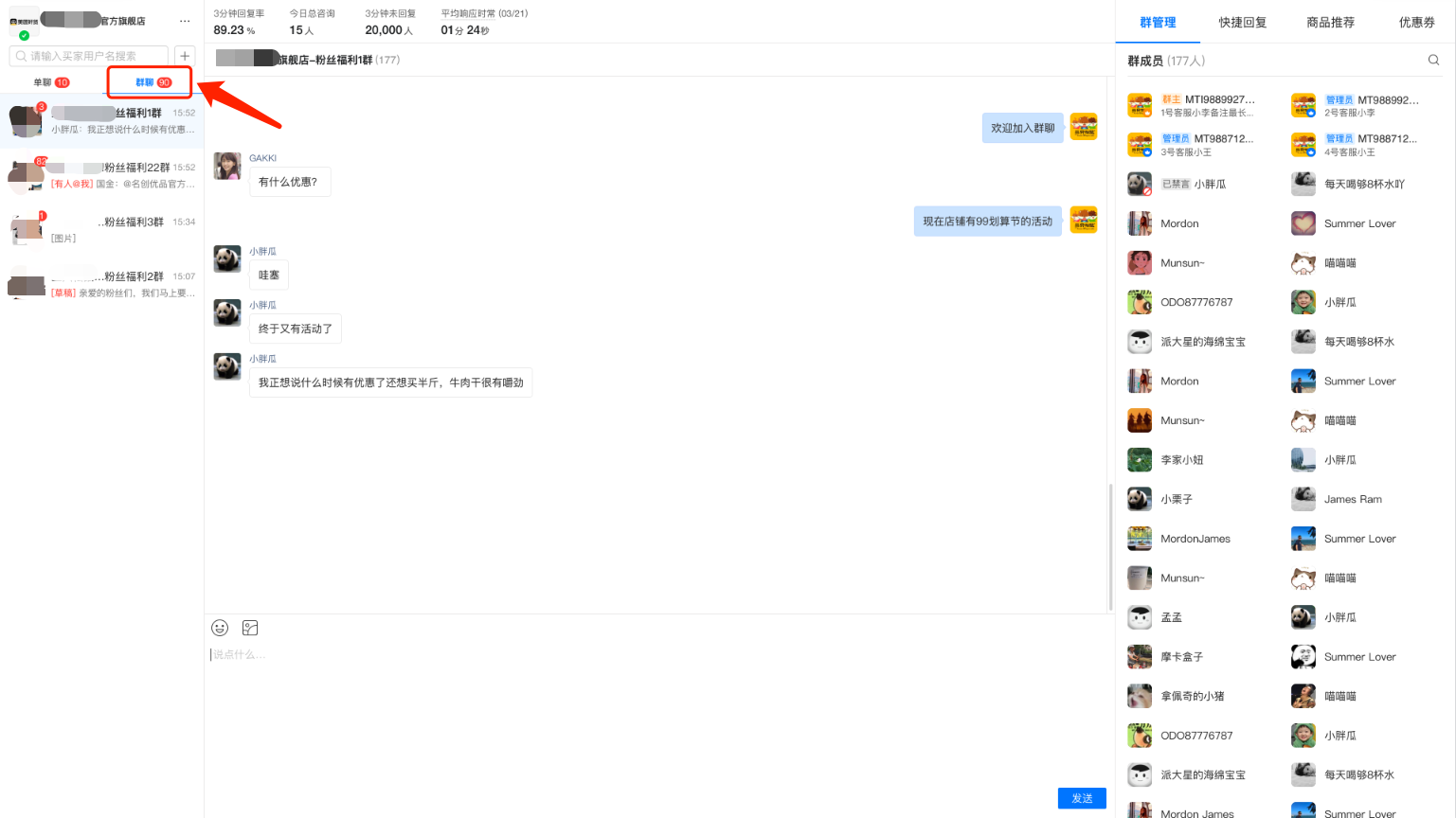 群内如何发消息? Customer Service Agent 2025年11月22日 13:30 开通群聊后,进入PC端商家后台客服平台,左侧的消息列表会展示“群聊”tab(开通后首次进入客服中心将提醒刷新页面分类),点击即可进入群聊会话列表; 评论 0 条评论 请登录写评论。