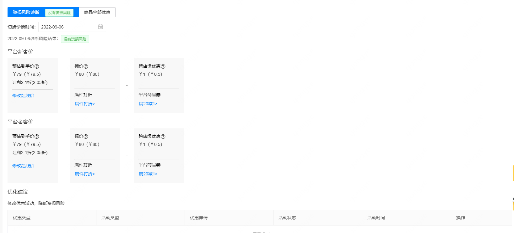 点击查看详情可以查看商品价格趋势、资损风险诊断以及优化建议。
