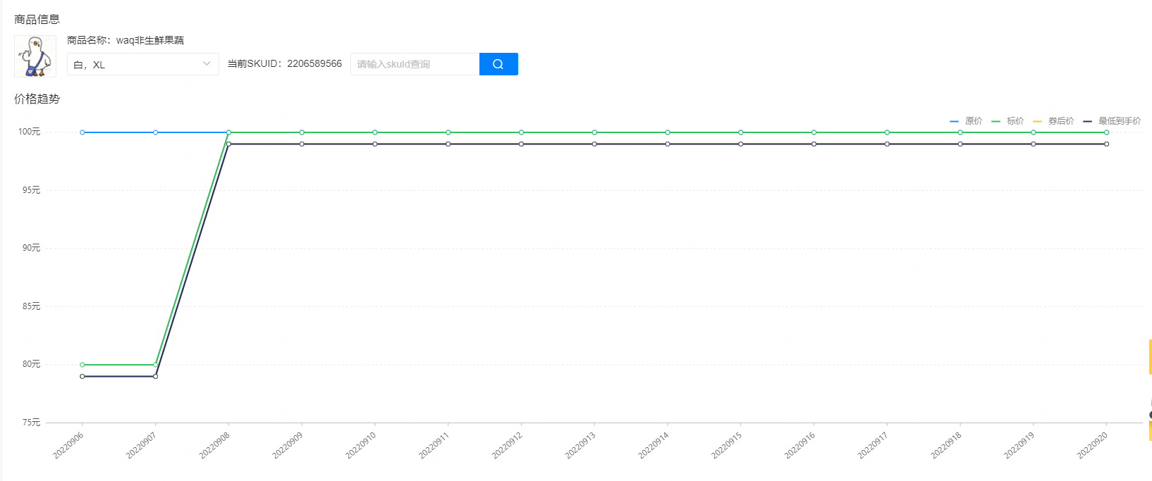 商品优惠查询是一个以商品ID为识别条件的查询工具,使用该功能可以查询商品过去-未来的价格趋势,可以看到商品平台新客价/平台老客价,同时会帮助诊断当前商品的低价资损风险并提供相应的营销建议。