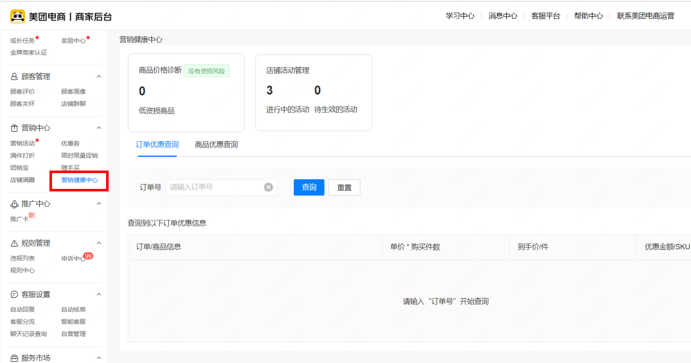 通过营销健康中心帮助商家诊断商品的补贴优惠情况,以及单品资损的预警提醒。同时为商家提供一个订单维度的优惠查询工具。