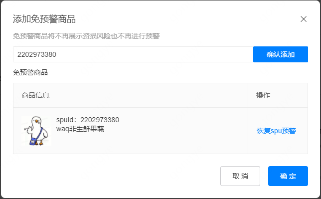 如果添加的是SPU,则该SPU都免预警,对应按钮变为【恢复预警】;