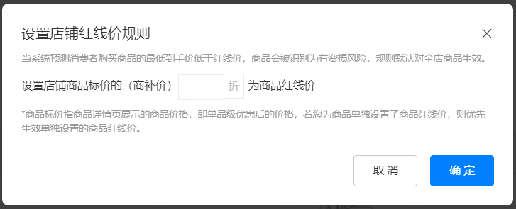 可设置店铺商品标价的(商补价)几折为商品红线价,当系统预测到手价低于红线价会被识别为有资损风险,如果单品单独设置了红线价,优先生效商品红线价。