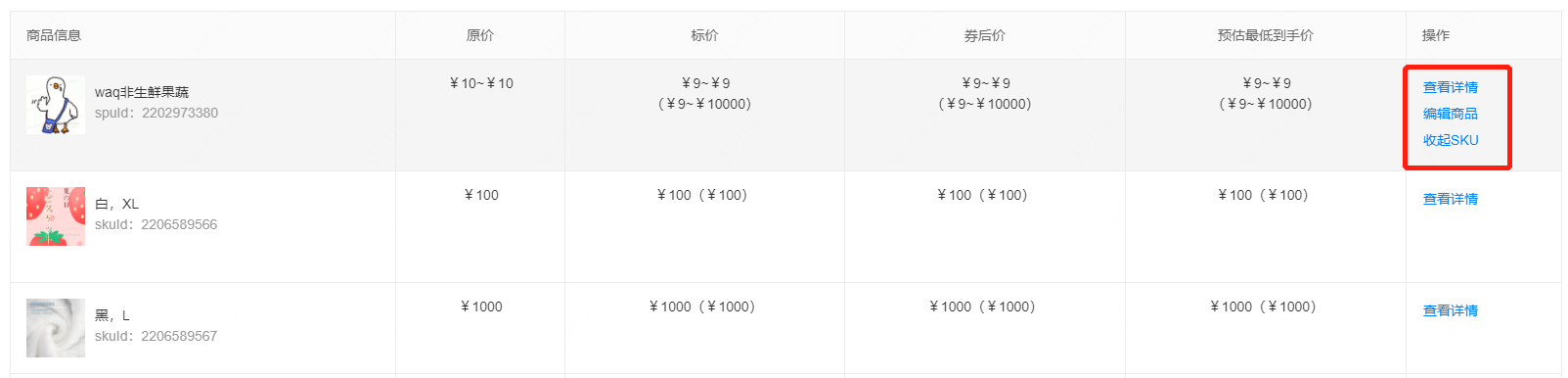 商品列表展示规则:展示SPU+SKU,可选择收起SKU;