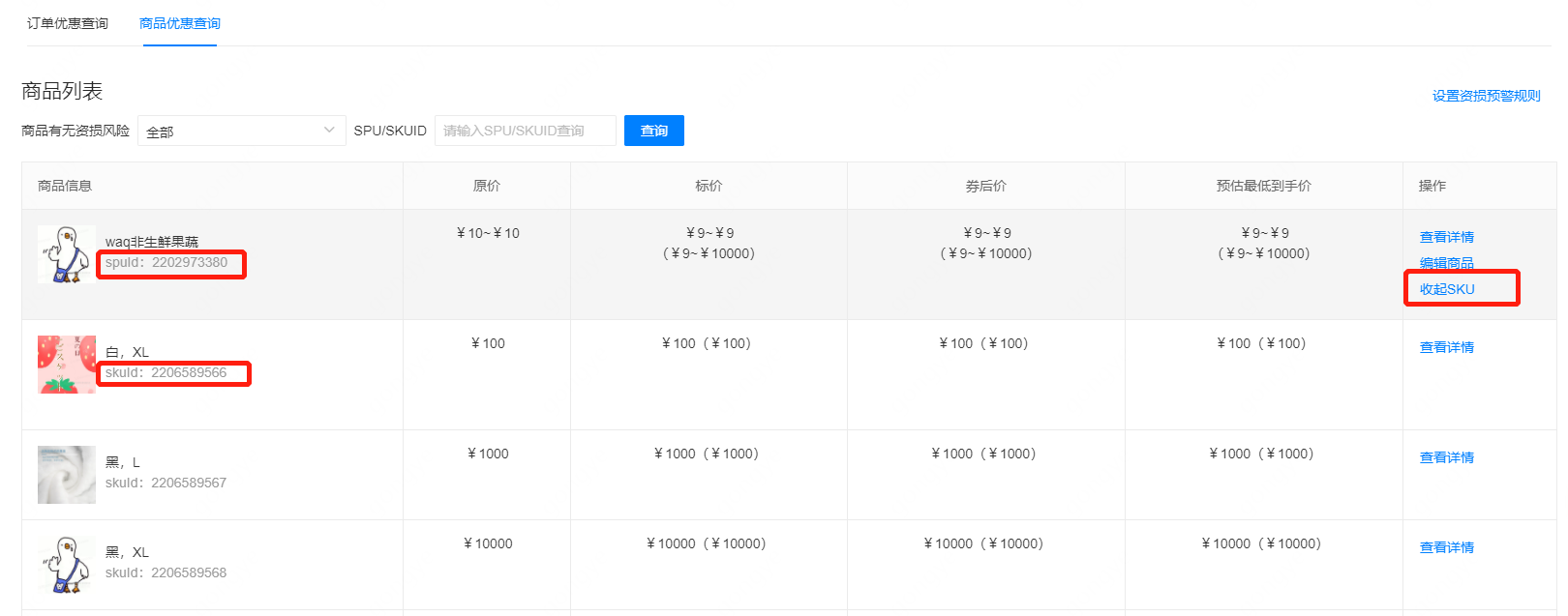 可通过商品有无资损风险、SPU/SKUID进行查询;